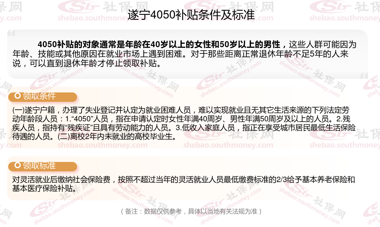 2024遂宁4050补贴主要针对的是年龄在40岁以上的女性和50岁以上的男性,这些人群通常因为年龄较大而面临就业困难。