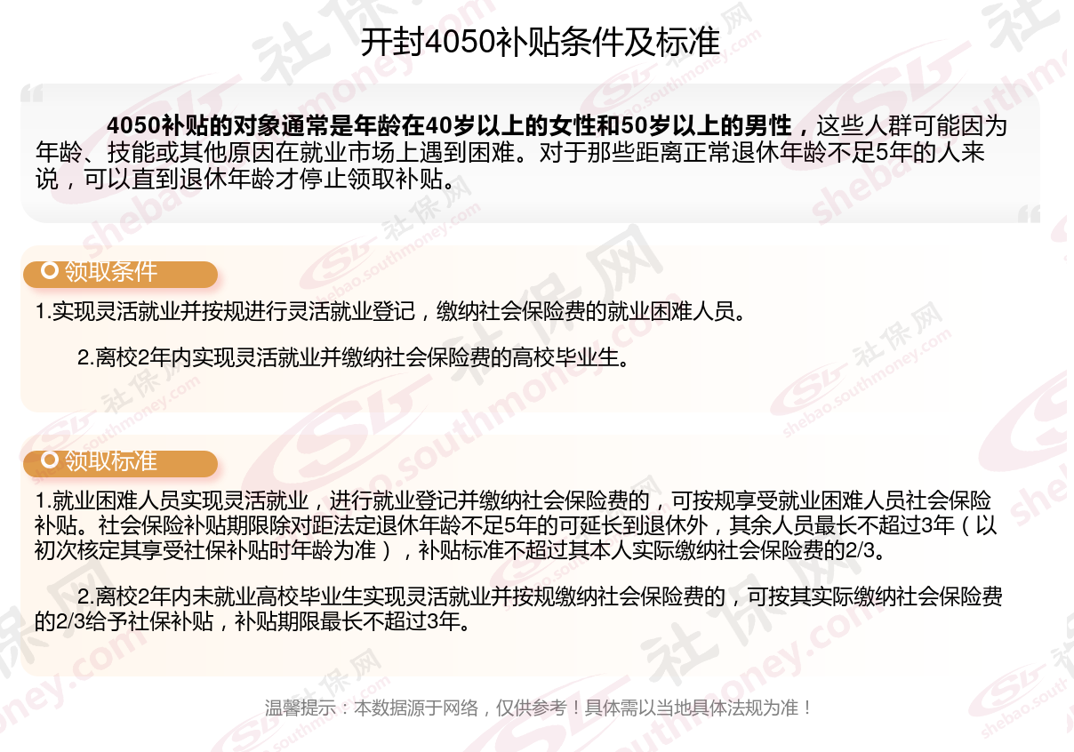 2024开封4050补贴主要针对的是年龄在40岁以上的女性和50岁以上的男性,这些人群通常因为年龄较大而面临就业困难。