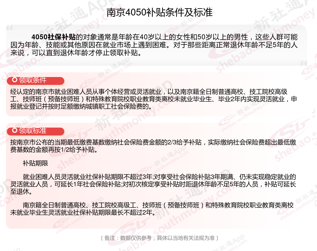 2024南京4050补贴主要针对的是年龄在40岁以上的女性和50岁以上的男性,这些人群通常因为年龄较大而面临就业困难。