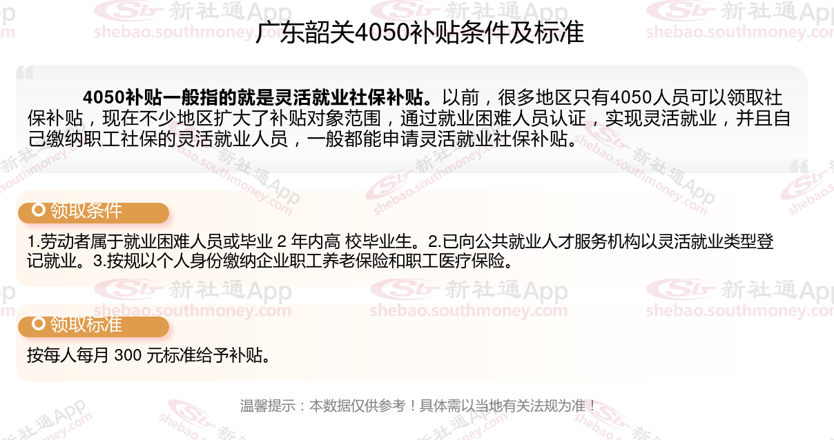 2024广东韶关灵活就业4050社保补贴是一项面向特定年龄段的就业困难人群的社会保险补贴。