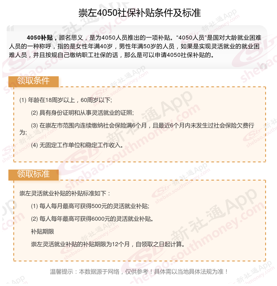 2024崇左灵活就业4050社保补贴是一项面向特定年龄段的就业困难人群的社会保险补贴。