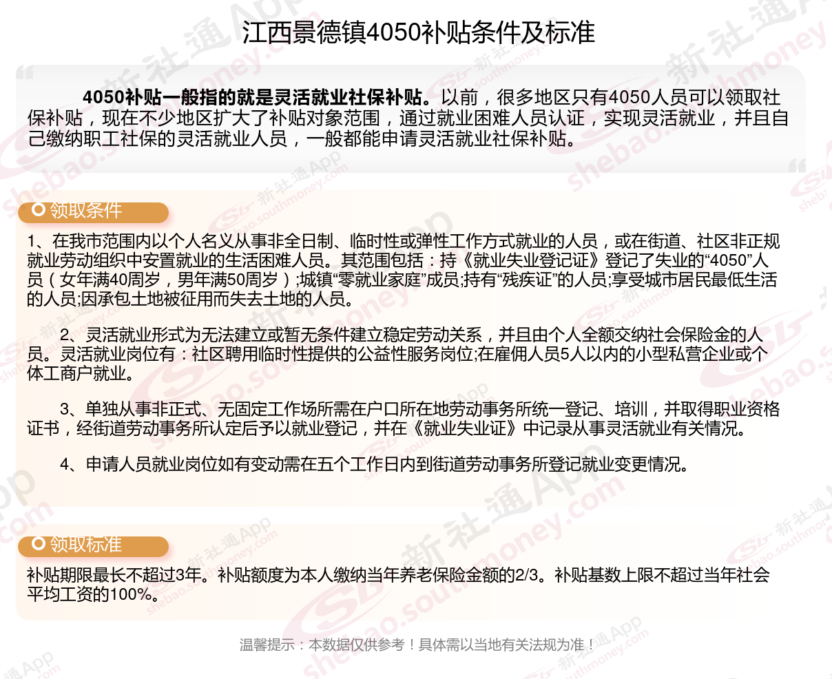 2024江西景德镇灵活就业4050社保补贴是一项面向特定年龄段的就业困难人群的社会保险补贴。