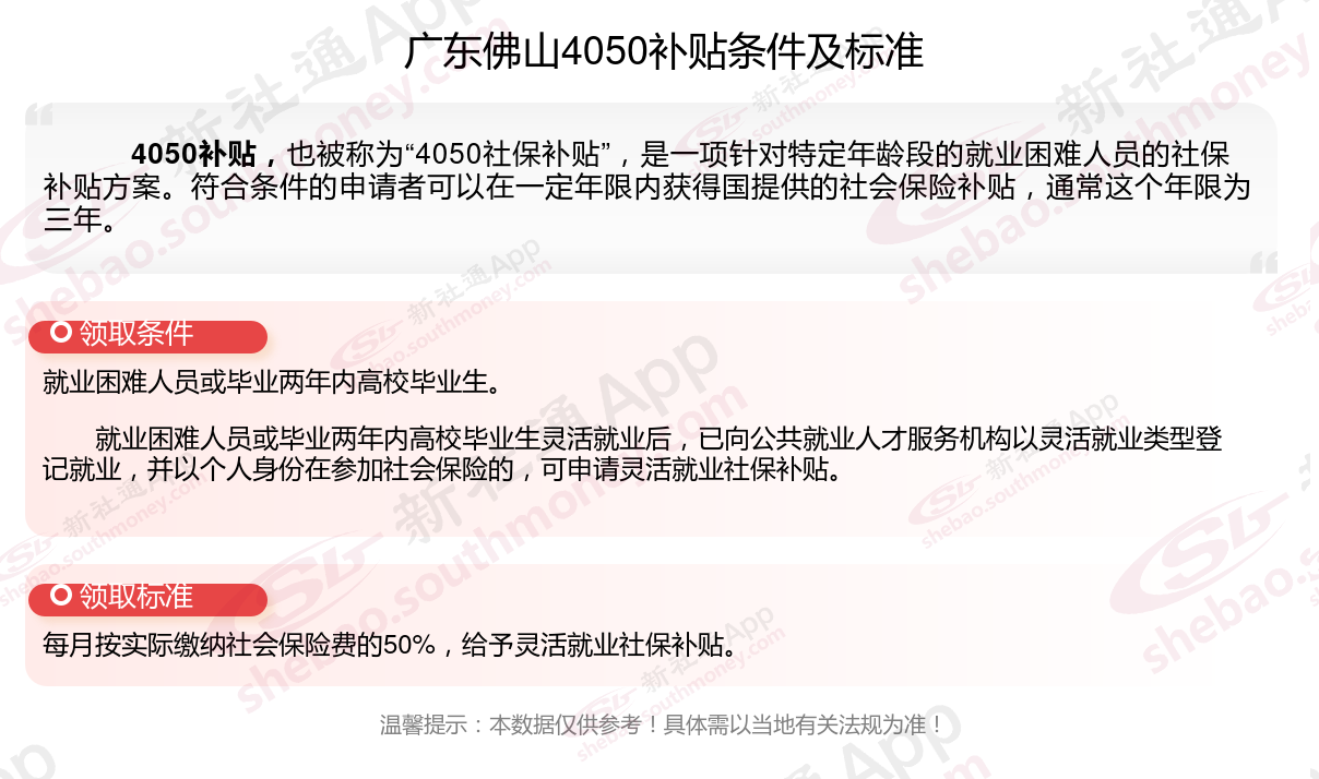 一、广东佛山4050社保补贴标准及条件2023-2024年