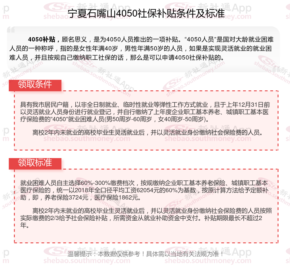 2024宁夏石嘴山灵活就业4050社保补贴是一项面向特定年龄段的就业困难人群的社会保险补贴。