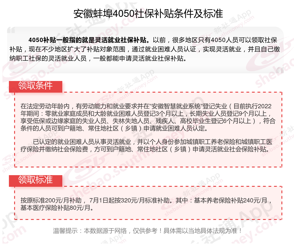 2024安徽蚌埠灵活就业4050社保补贴是一项面向特定年龄段的就业困难人群的社会保险补贴。