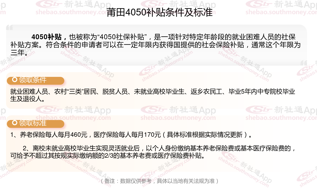 2024莆田4050补贴主要针对的是年龄在40岁以上的女性和50岁以上的男性,这些人群通常因为年龄较大而面临就业困难。