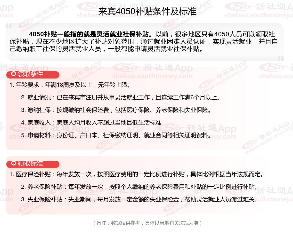 2024来宾灵活就业4050社保补贴是一项面向特定年龄段的就业困难人群的社会保险补贴。