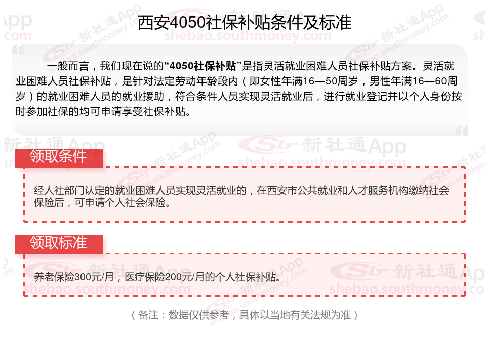 “4050人员”是国对大龄就业困难人员的一种称呼,指的是女性年满40岁,男性年满50岁的人员,那么西安4050灵活就业社保补贴标准是多少钱?西安4050社保补贴条件是什么?接下来随新社通APP小编了解一下最新资讯。
