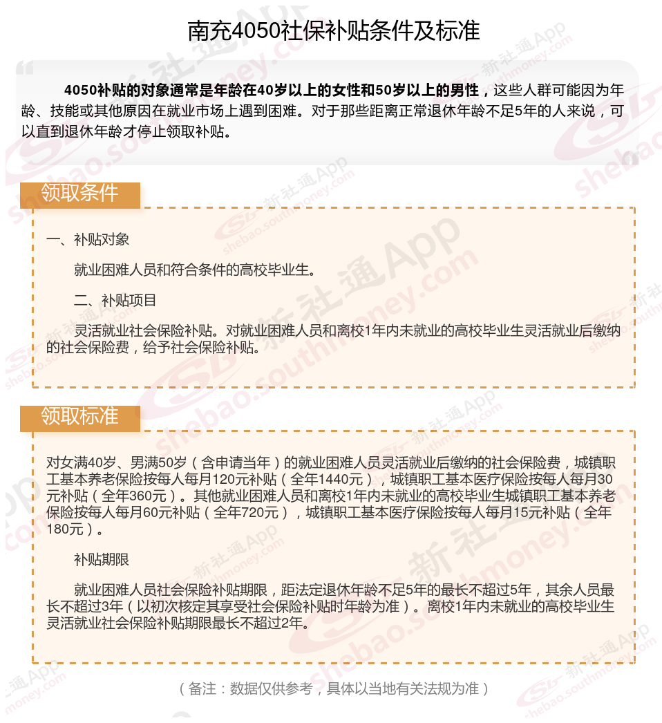 2024南充灵活就业4050社保补贴是一项面向特定年龄段的就业困难人群的社会保险补贴。