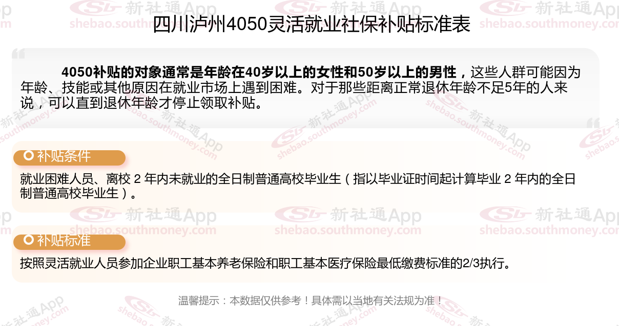 一、2023-2024年四川泸州4050社保补贴标准及条件,最新如下