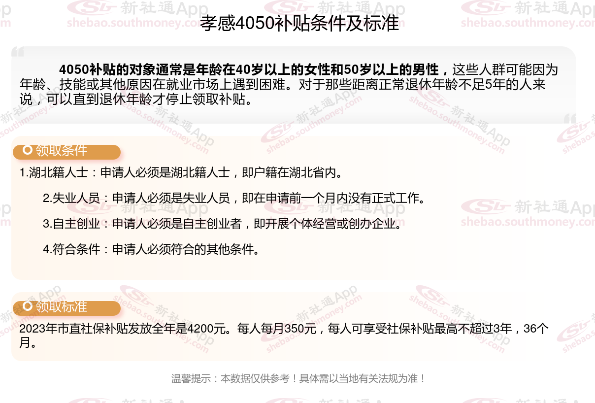 2024孝感4050补贴主要针对的是年龄在40岁以上的女性和50岁以上的男性,这些人群通常因为年龄较大而面临就业困难。