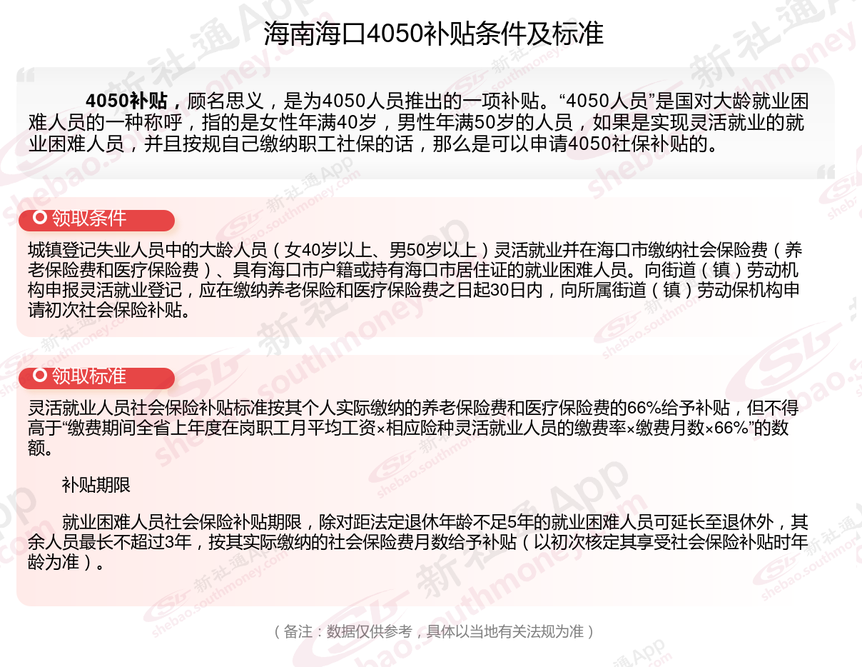 多数地区只有4050人员可以领取社保补贴,现在扩大了补贴对象及范围,通过就业困难人员认证,实现灵活就业,并且自己缴纳职工社保的灵活就业人员,一般都能申请灵活就业社保补贴。那么海南海口4050灵活就业社保补贴标准是多少钱?海南海口4050社保补贴条件是什么?接下来随新社通APP小编了解一下最新资讯。
