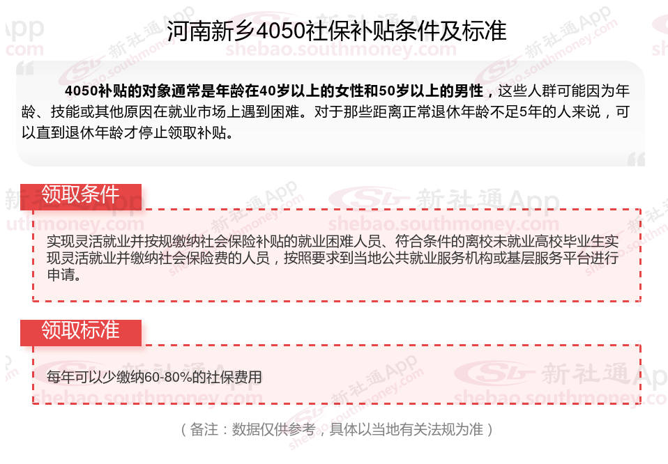 一、河南新乡4050社保补贴标准及条件2023-2024年