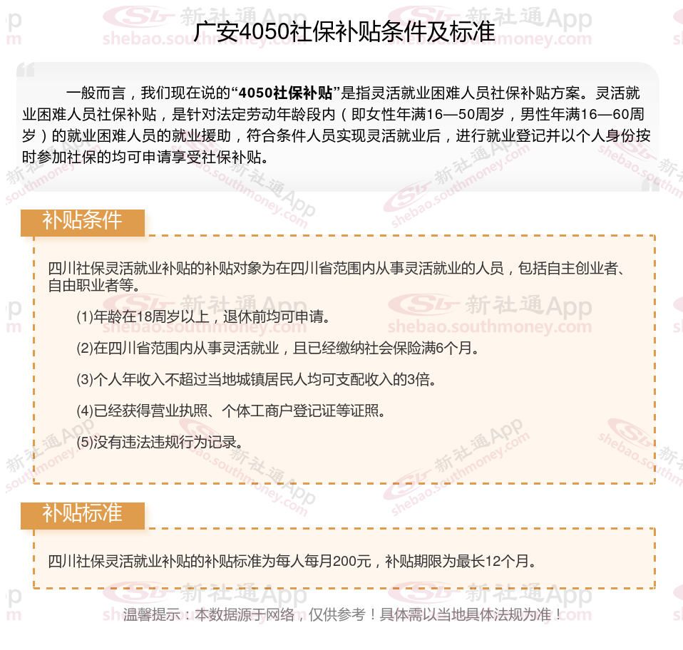 2024广安灵活就业4050社保补贴是一项面向特定年龄段的就业困难人群的社会保险补贴。