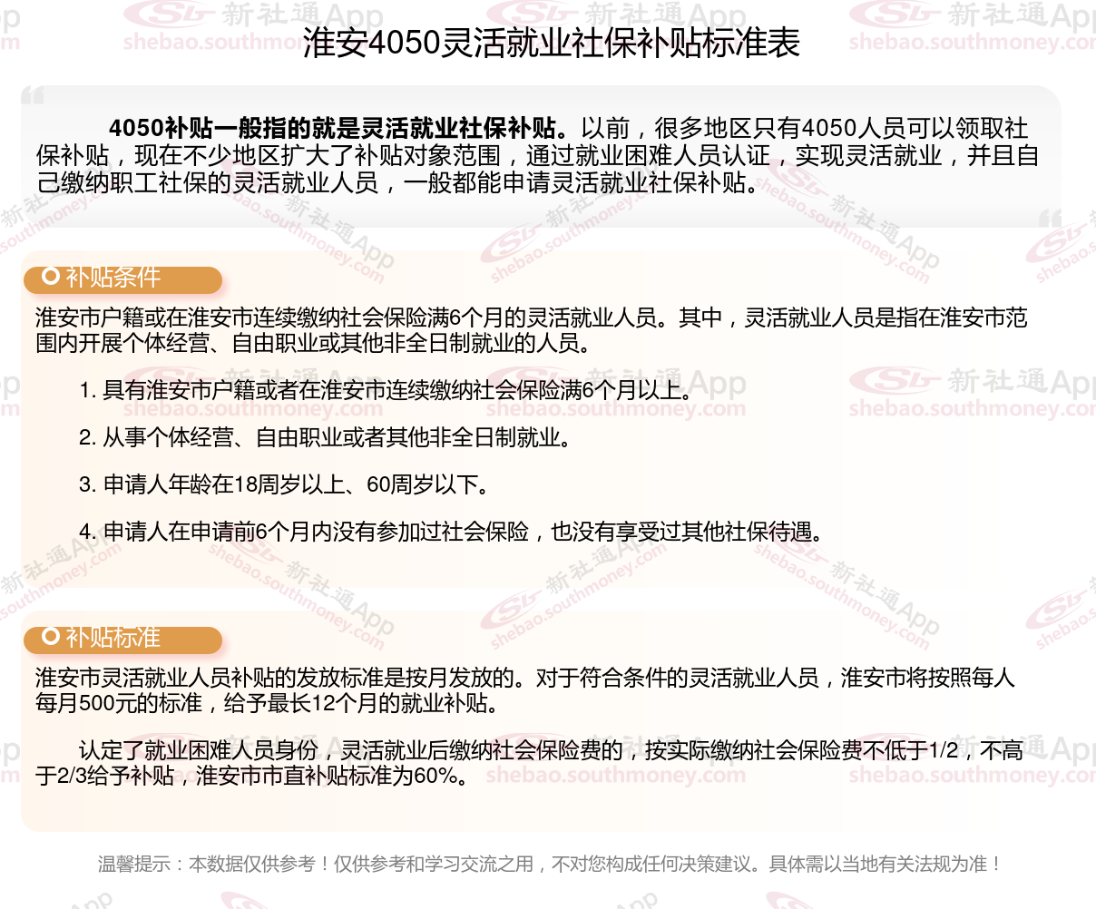 2024淮安灵活就业4050社保补贴是一项面向特定年龄段的就业困难人群的社会保险补贴。