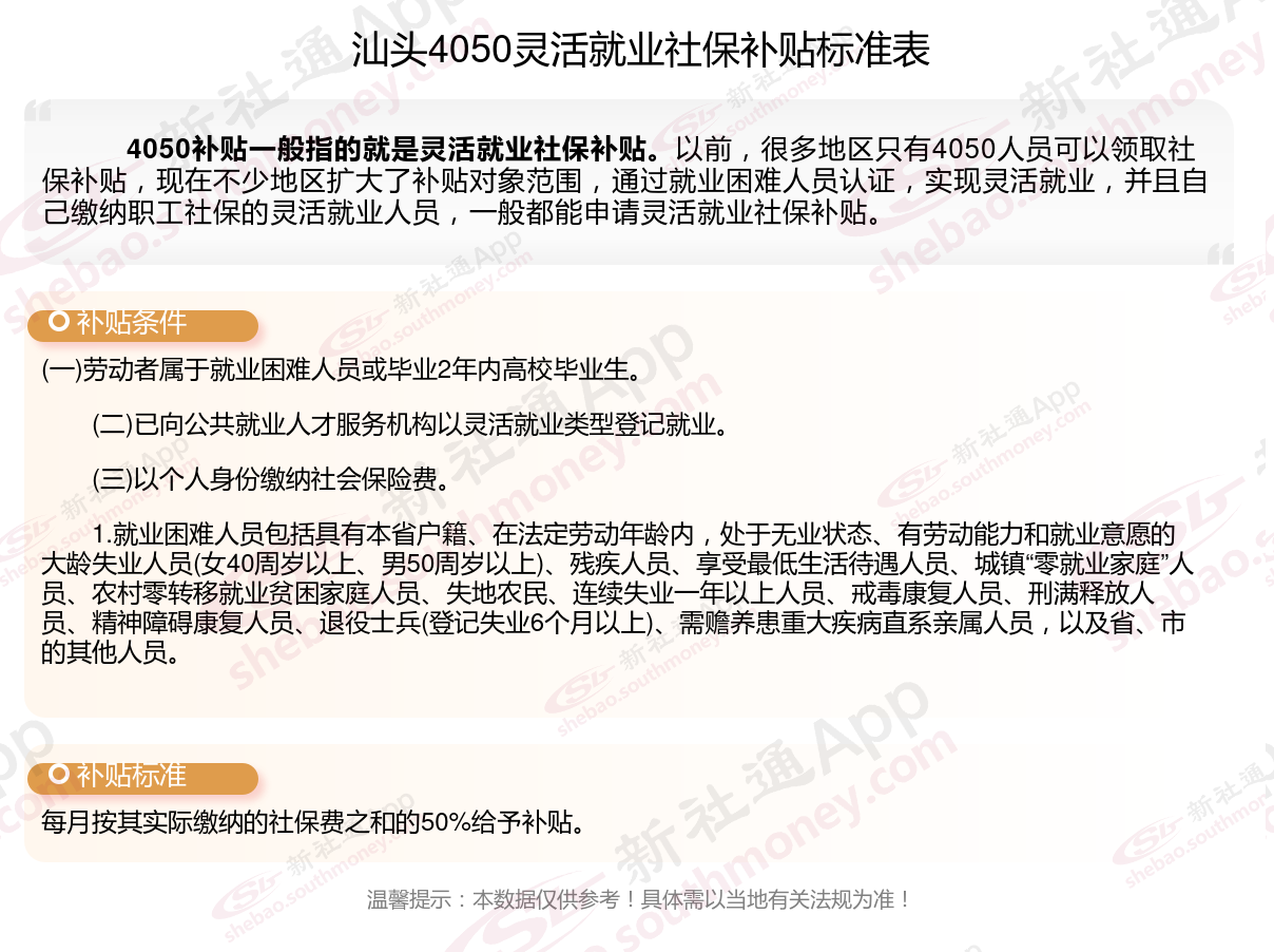 一、2023-2024年汕头4050社保补贴标准及条件,最新如下