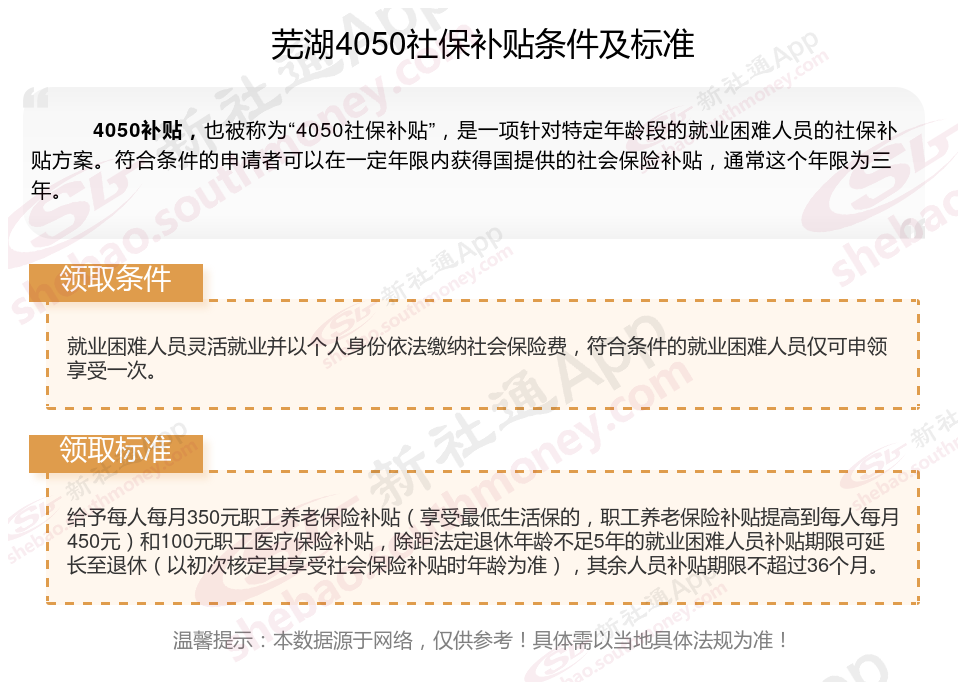 一、2023-2024年芜湖4050社保补贴标准及条件,最新如下