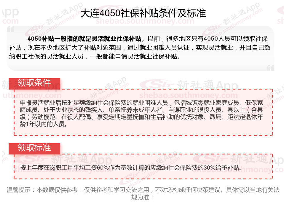 2024大连灵活就业4050社保补贴是一项面向特定年龄段的就业困难人群的社会保险补贴。