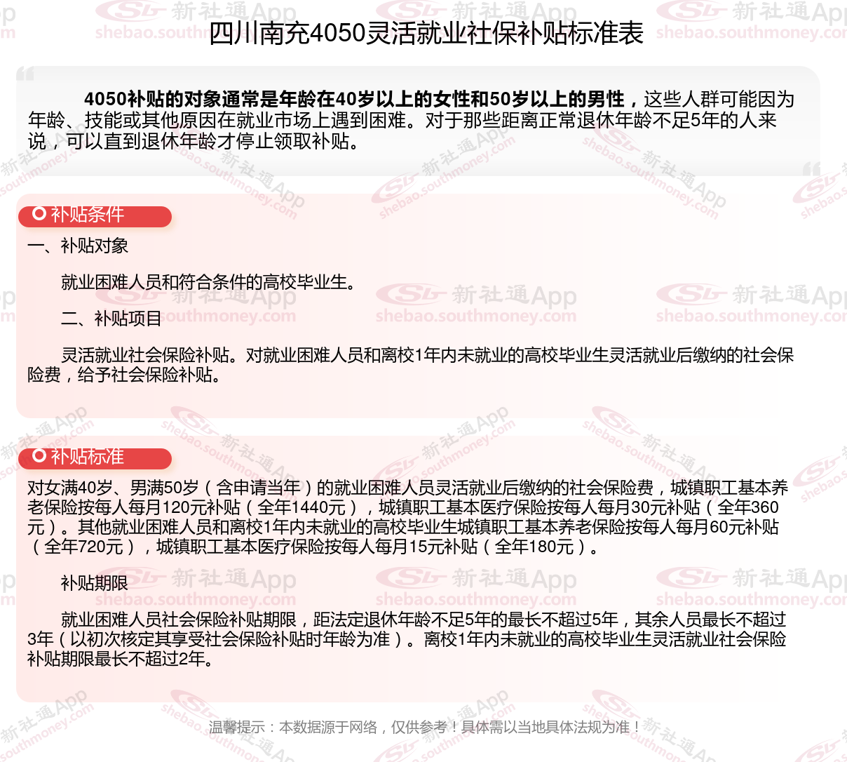以上就是四川南充4050灵活就业社保补贴的相关内容,欢迎关注新社通/下载新社通APP了解更多五险一金专业资讯。