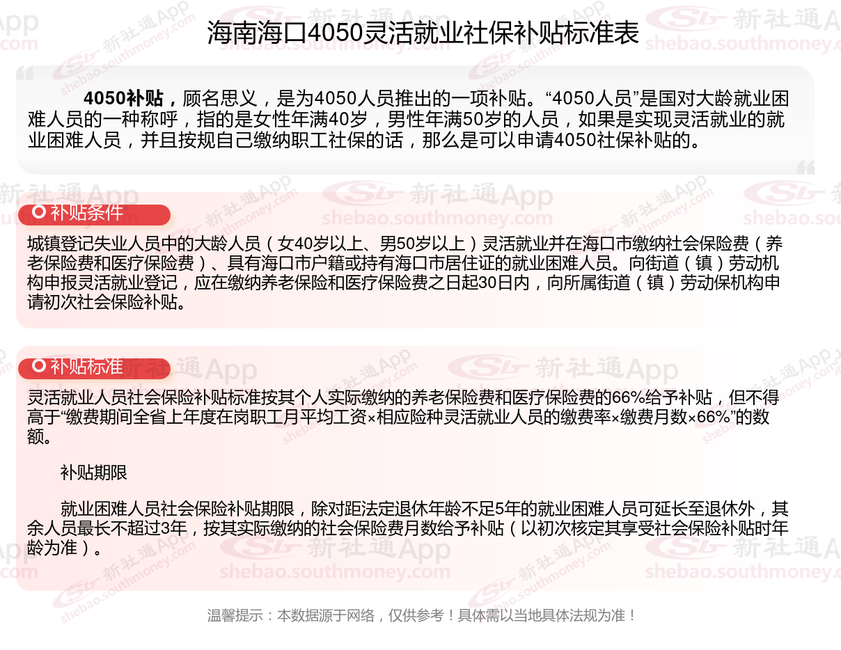 2024海南海口灵活就业4050社保补贴是一项面向特定年龄段的就业困难人群的社会保险补贴。