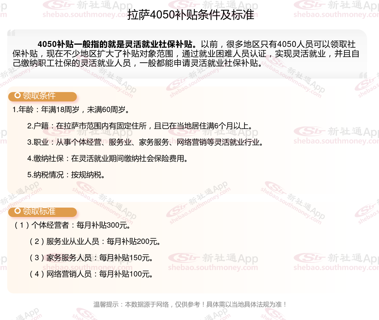2024拉萨灵活就业4050社保补贴是一项面向特定年龄段的就业困难人群的社会保险补贴。