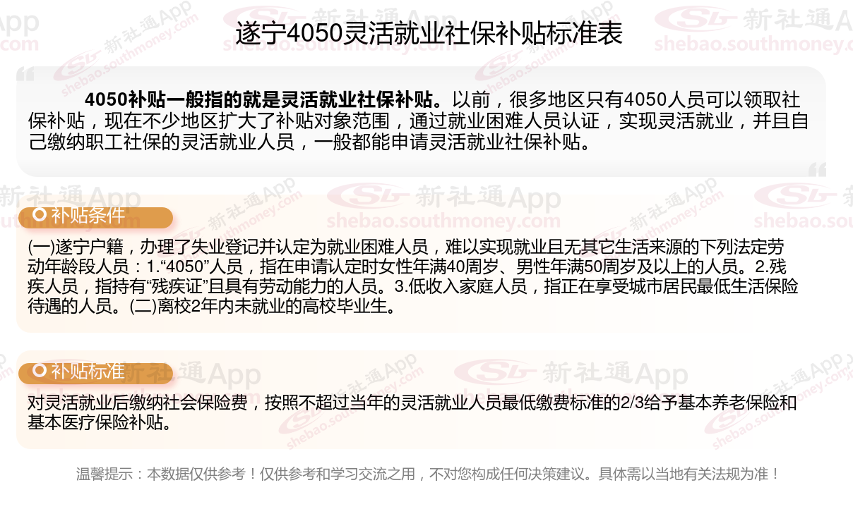 2024遂宁灵活就业4050社保补贴是一项面向特定年龄段的就业困难人群的社会保险补贴。