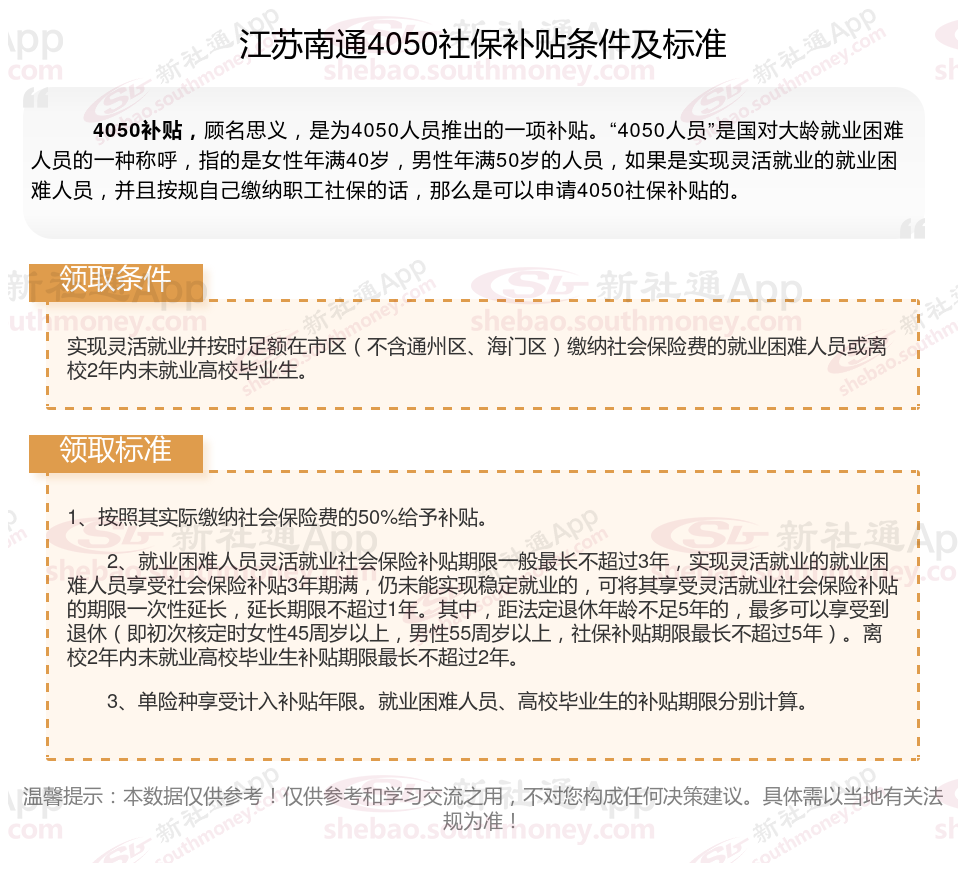 二、2023-2024年江苏南通4050社保补贴标准及条件