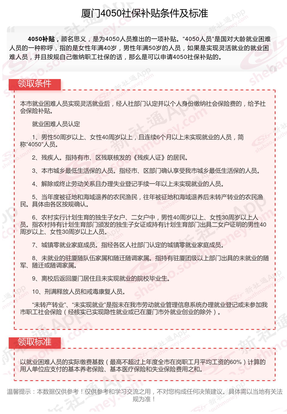 2024厦门4050补贴主要针对的是年龄在40岁以上的女性和50岁以上的男性,这些人群通常因为年龄较大而面临就业困难。