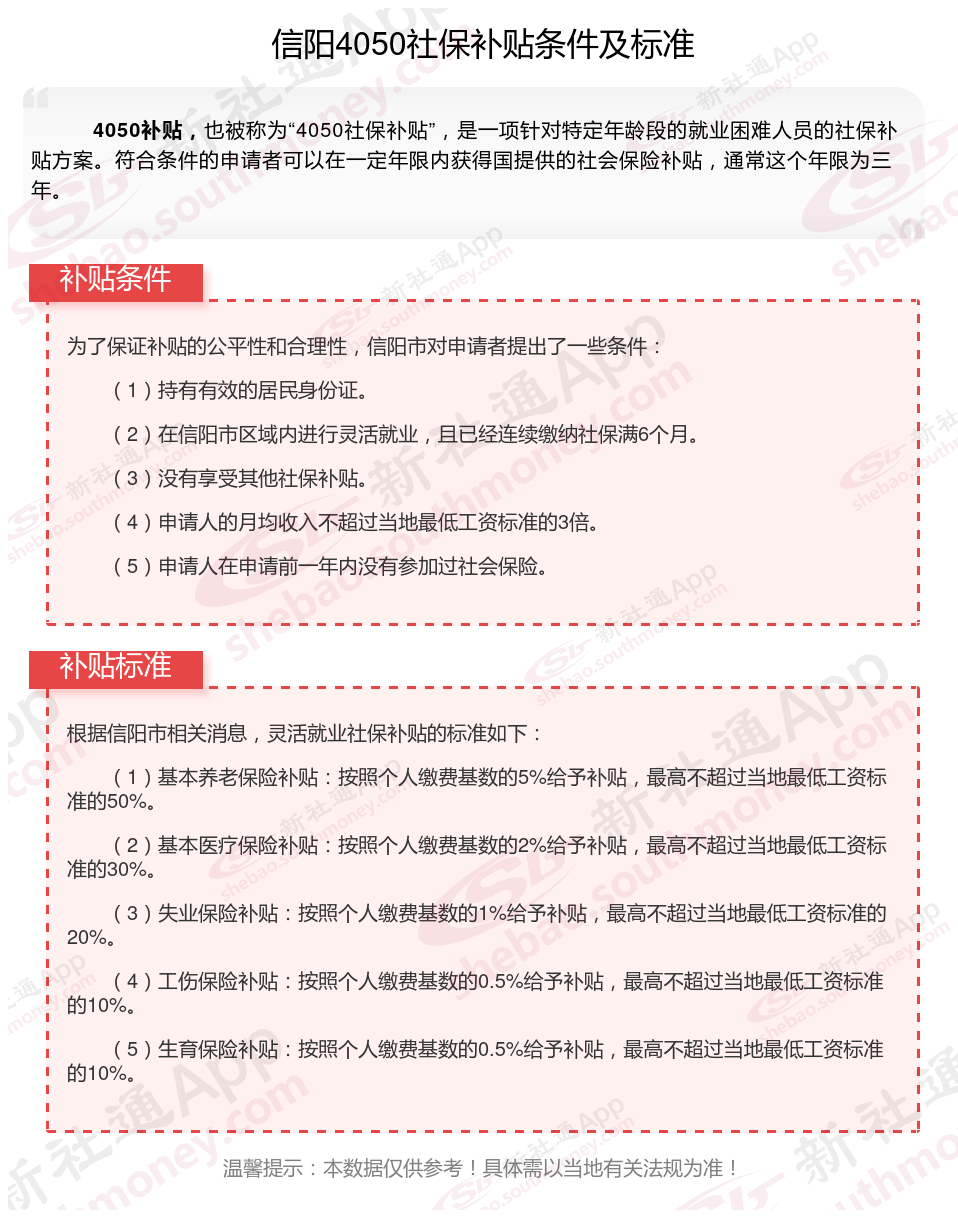 二、信阳4050社保补贴标准及条件2023-2024年,最新如下