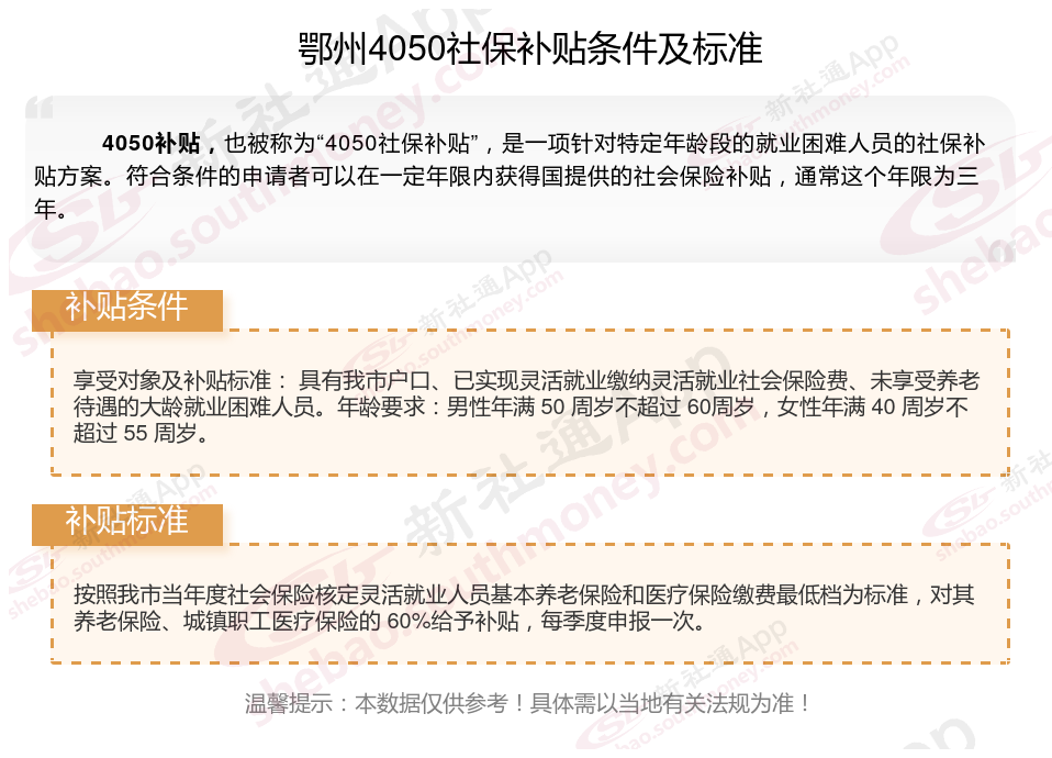 以上就是鄂州4050灵活就业困难人员社保补贴的相关内容,欢迎关注新社通/下载新社通APP了解更多五险一金专业资讯。