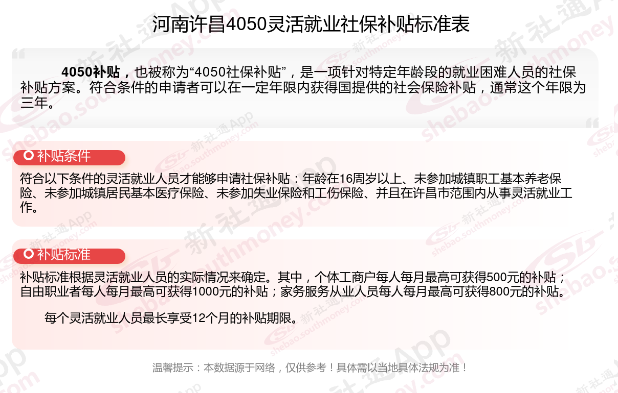 以上就是河南许昌4050灵活就业社保补贴的相关内容,欢迎关注新社通/下载新社通APP了解更多五险一金专业资讯。