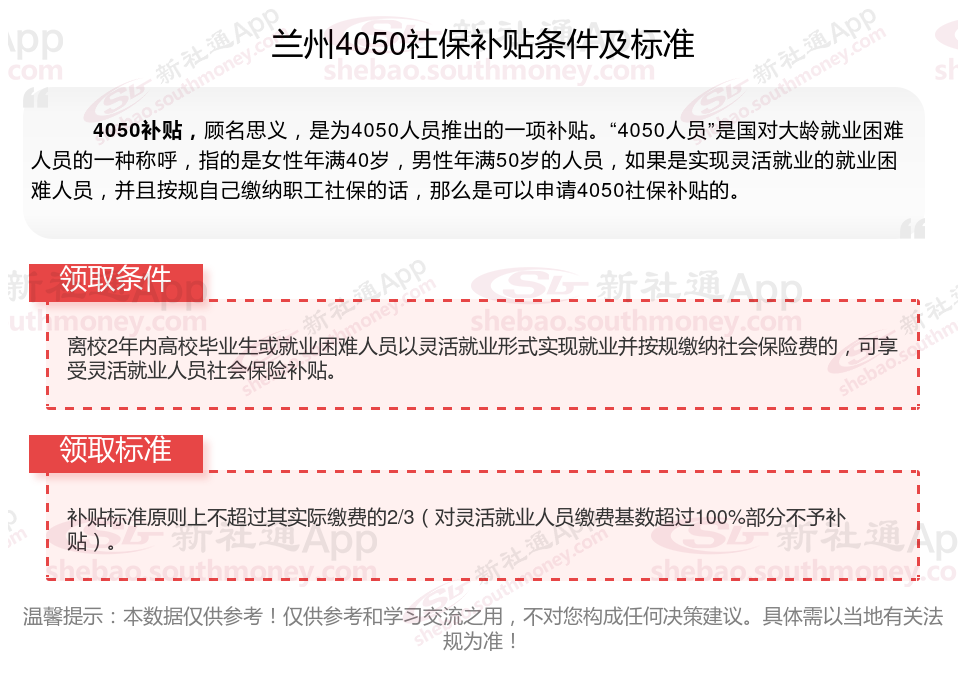 一、兰州灵活就业4050社保补贴标准及条件是什么