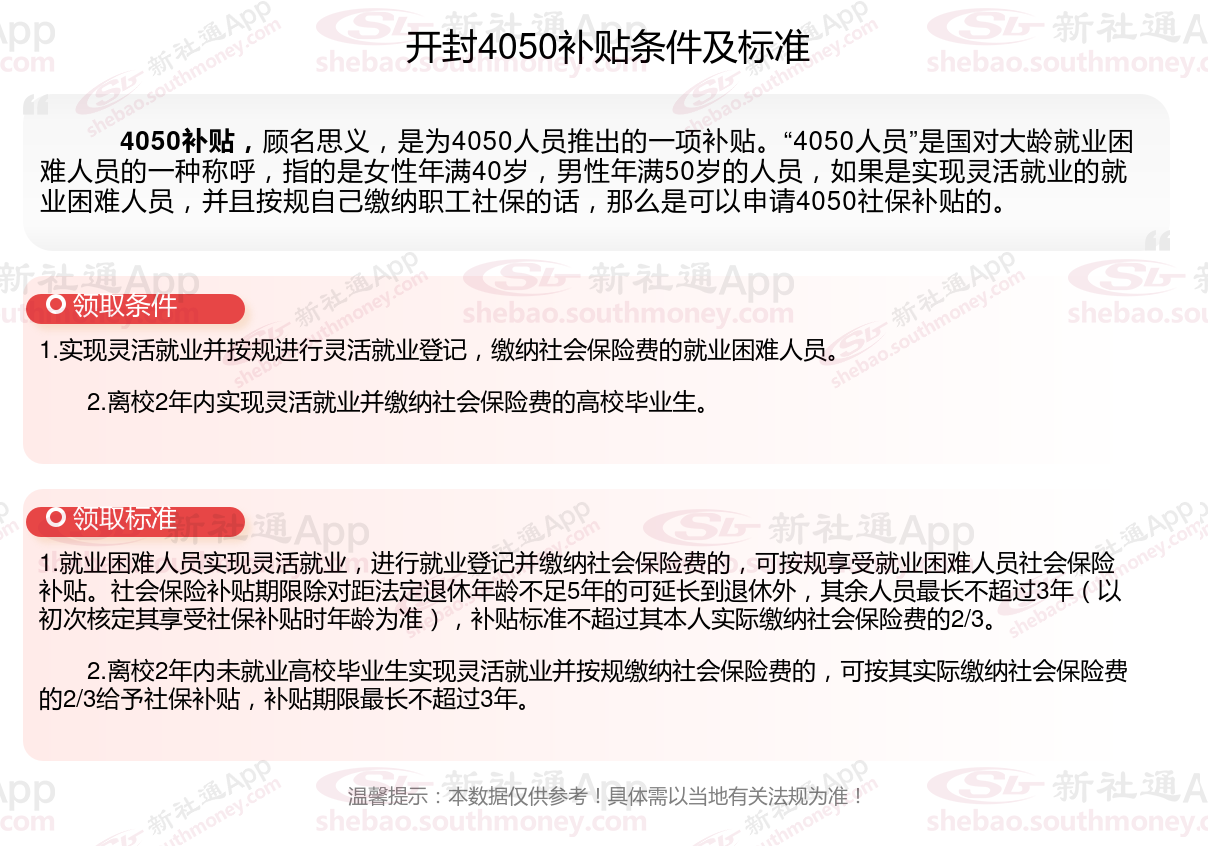 2024开封灵活就业4050社保补贴是一项面向特定年龄段的就业困难人群的社会保险补贴。