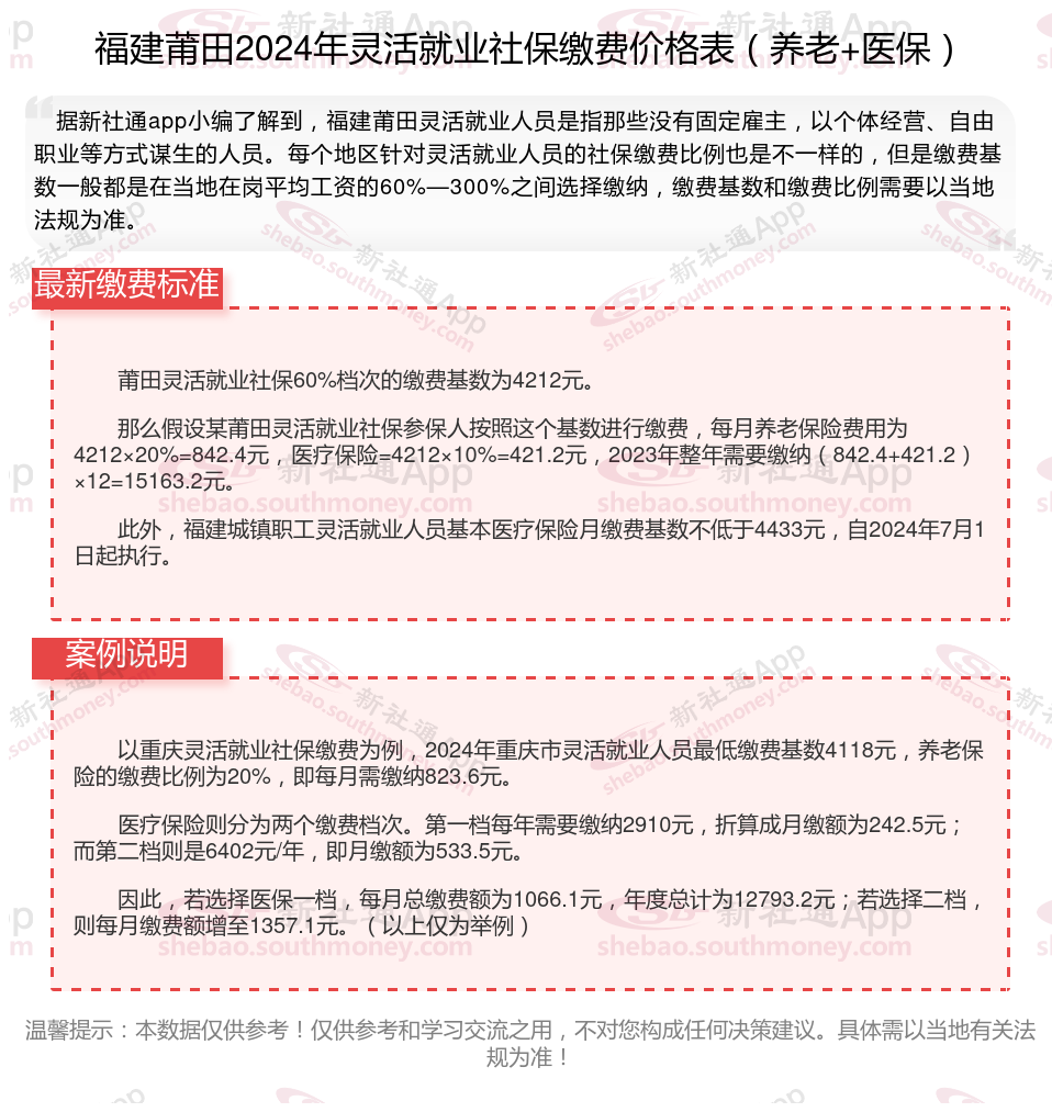 三、福建莆田2024年灵活就业社保缴费基数及比例最新消息