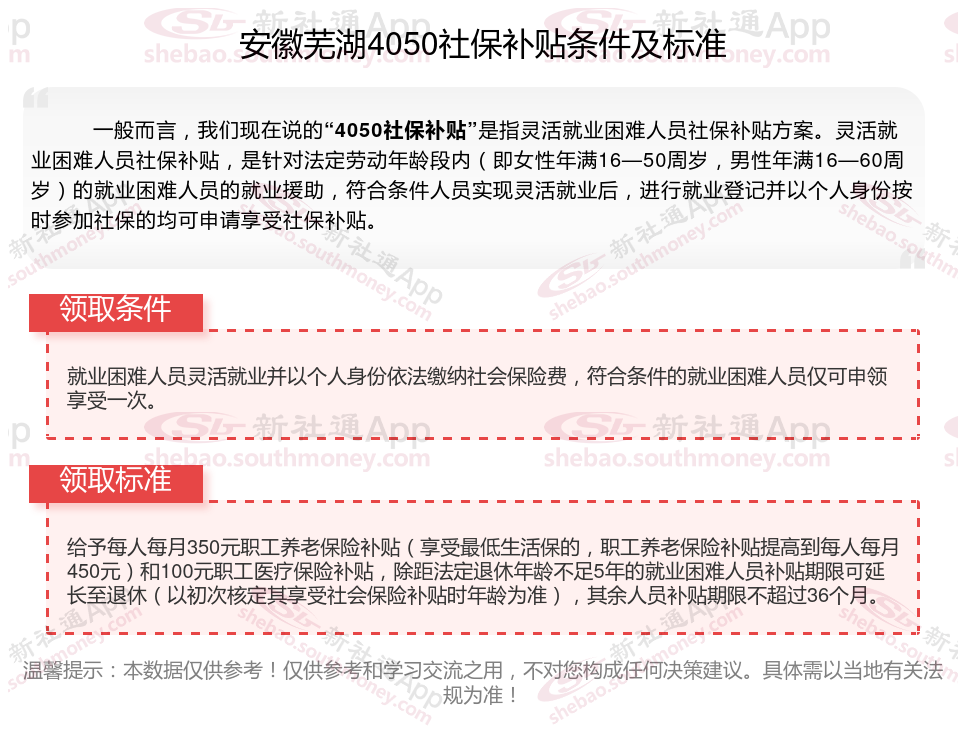 2024安徽芜湖灵活就业4050社保补贴是一项面向特定年龄段的就业困难人群的社会保险补贴。