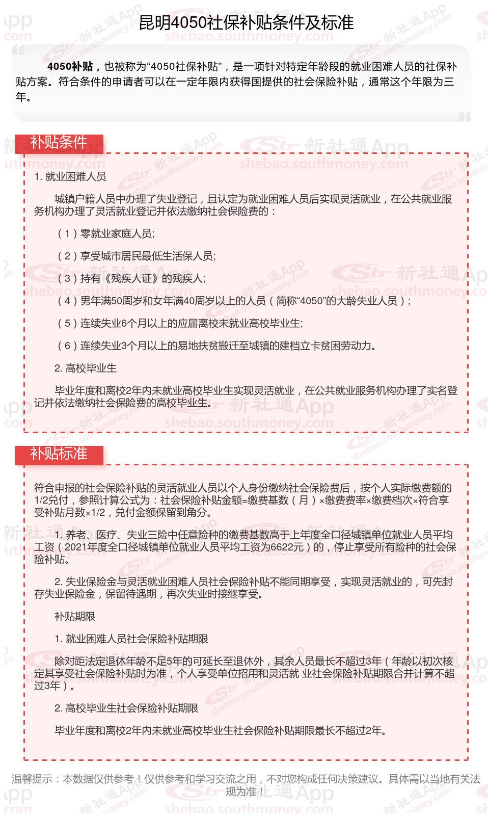 二、昆明4050社保补贴标准及条件2023-2024年,最新如下