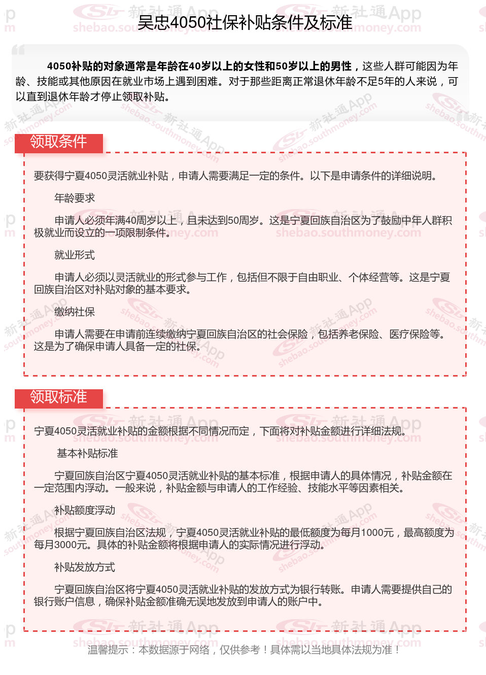 2024吴忠灵活就业4050社保补贴是一项面向特定年龄段的就业困难人群的社会保险补贴。