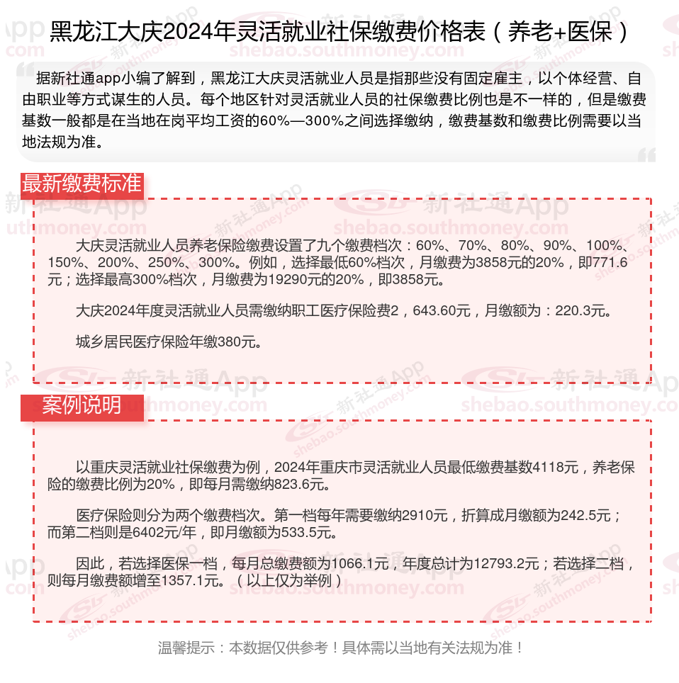三、黑龙江大庆2024年灵活就业社保缴费基数及比例最新消息