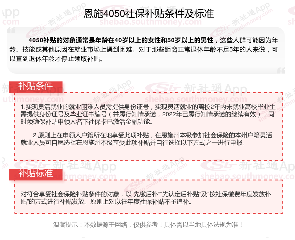 2024恩施4050补贴主要针对的是年龄在40岁以上的女性和50岁以上的男性,这些人群通常因为年龄较大而面临就业困难。