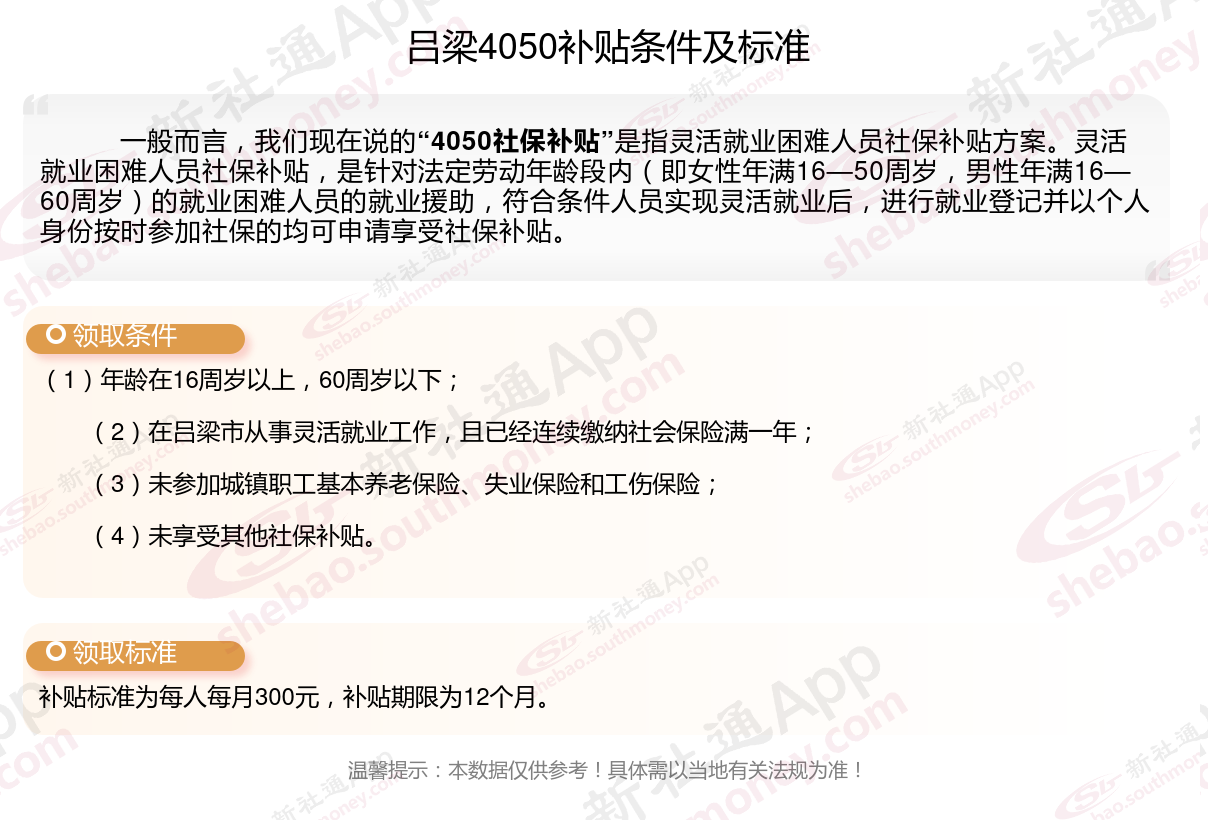 二、吕梁4050社保补贴标准及条件2023-2024年,最新如下