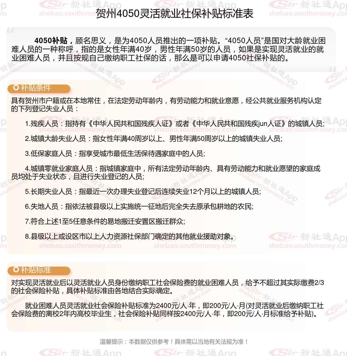 2024贺州灵活就业4050社保补贴是一项面向特定年龄段的就业困难人群的社会保险补贴。