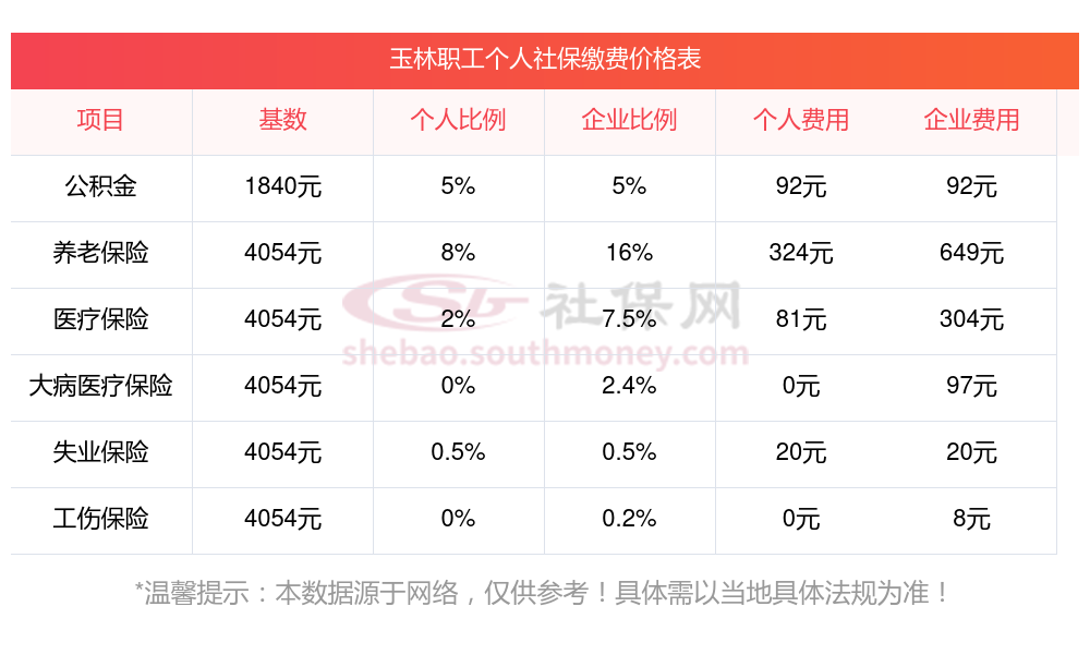 玉林的社保缴费情况,依据2024年最新的缴费标准,我们可以详细地进行如下说明。这些标准是根据新社通app-社保缴费查询工具提供的数据整理得出的: