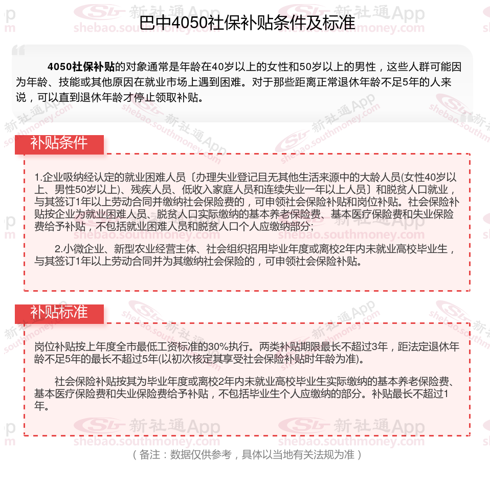 2024巴中4050补贴主要针对的是年龄在40岁以上的女性和50岁以上的男性,这些人群通常因为年龄较大而面临就业困难。