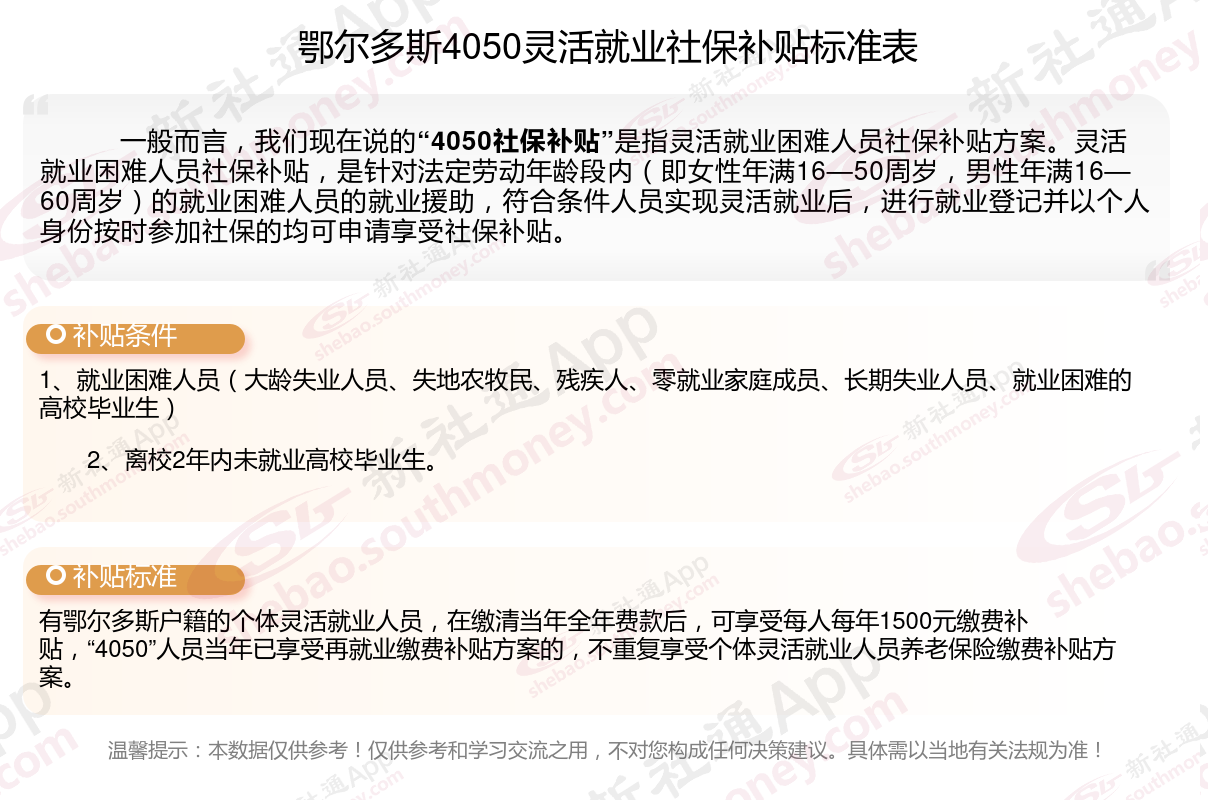 2024鄂尔多斯灵活就业4050社保补贴是一项面向特定年龄段的就业困难人群的社会保险补贴。