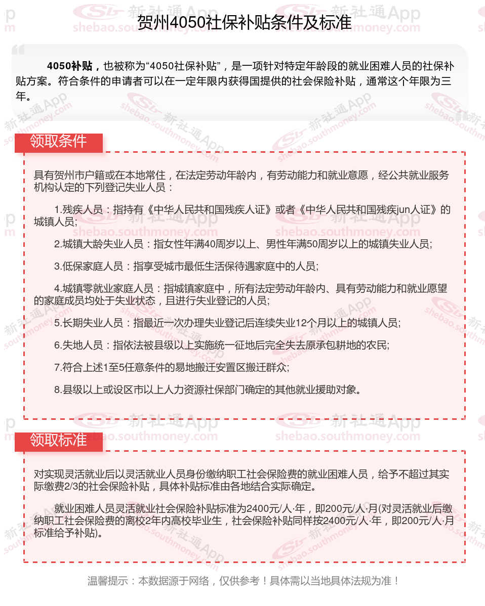 2024贺州灵活就业4050社保补贴是一项面向特定年龄段的就业困难人群的社会保险补贴。