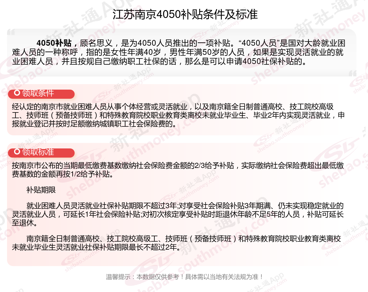 一、江苏南京4050社保补贴标准及条件2023-2024年