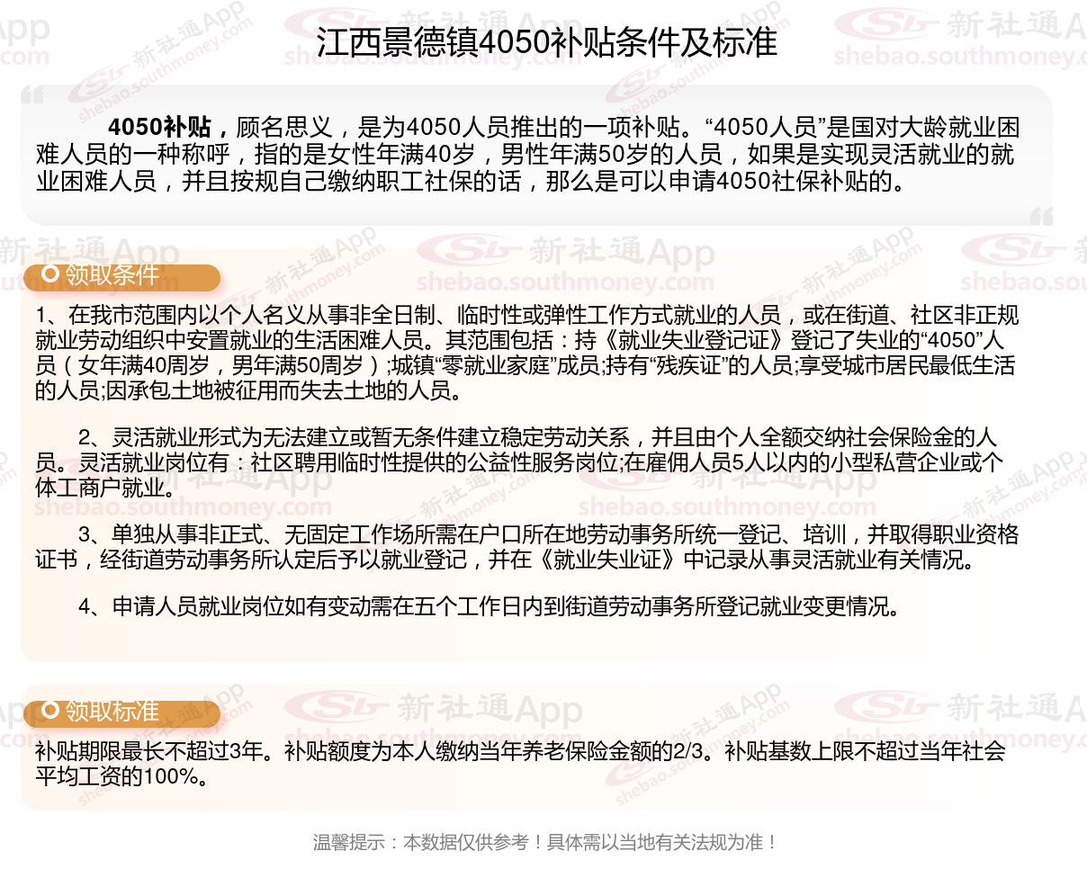 2024江西景德镇灵活就业4050社保补贴是一项面向特定年龄段的就业困难人群的社会保险补贴。