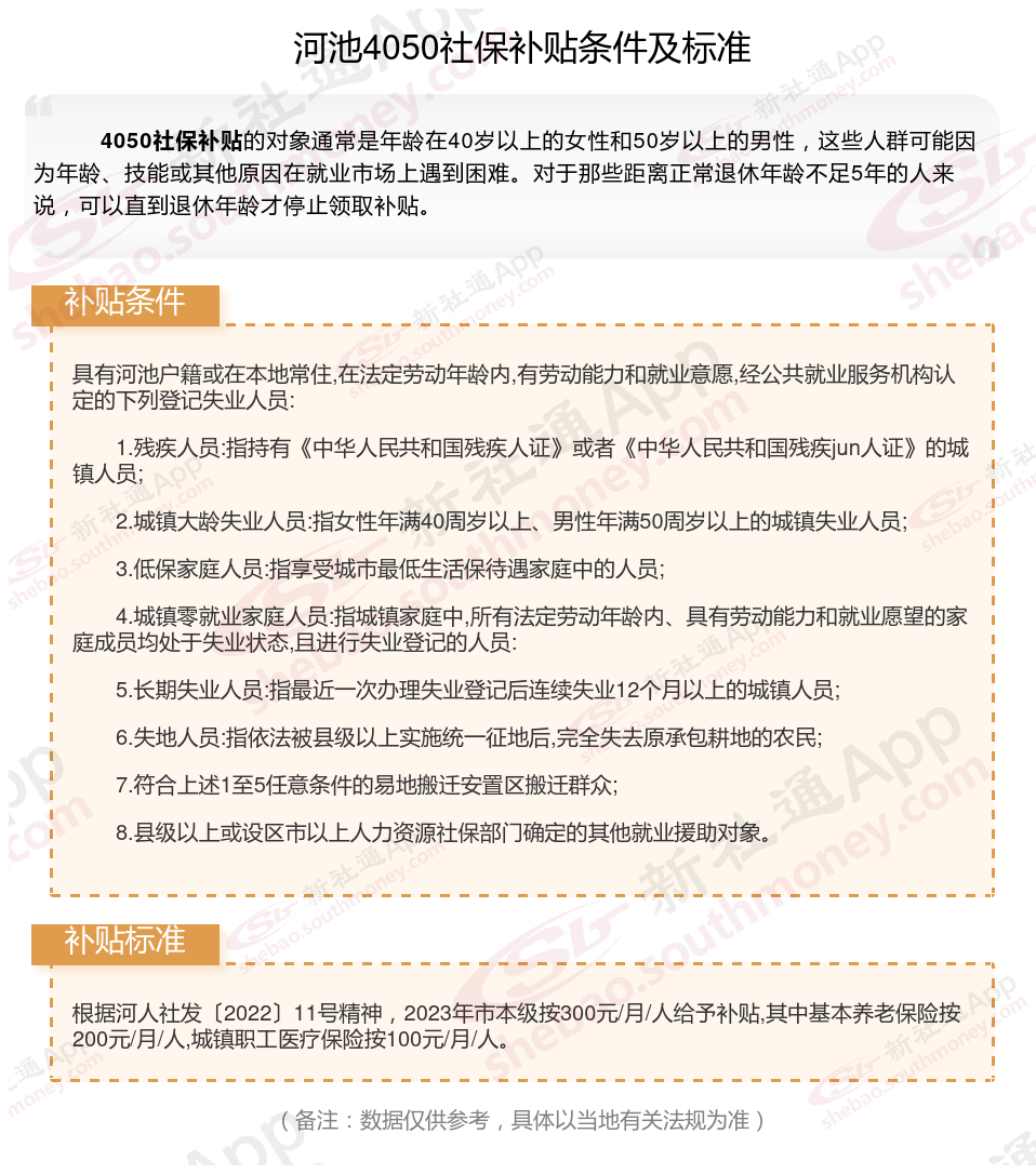 “4050人员”是国对大龄就业困难人员的一种称呼,指的是女性年满40岁,男性年满50岁的人员,那么河池4050灵活就业社保补贴标准是多少钱?河池4050社保补贴条件是什么?接下来随新社通APP小编了解一下最新资讯。