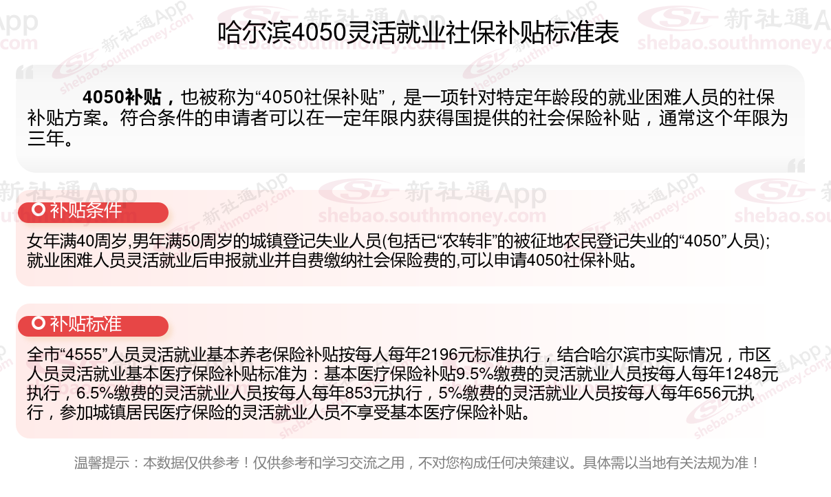 一、哈尔滨4050社保补贴标准及条件2023-2024年