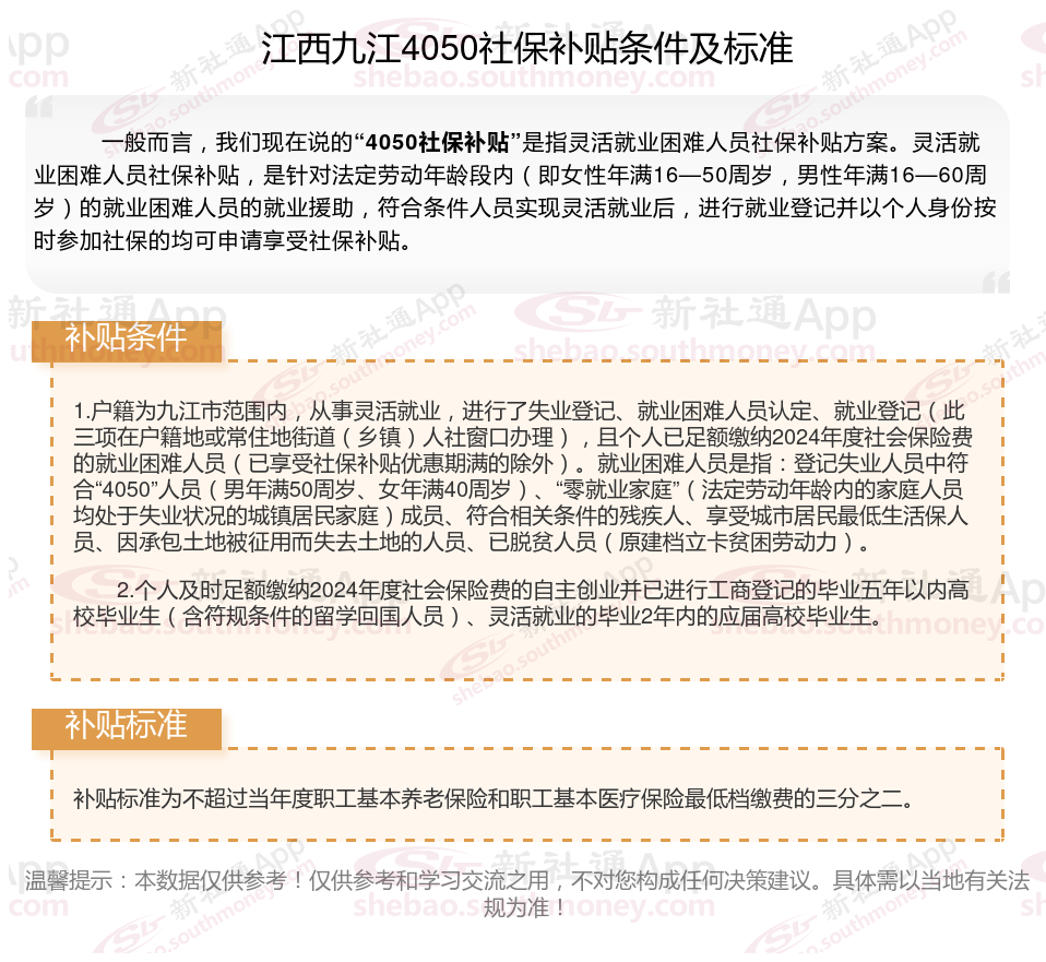 一、江西九江4050社保补贴标准及条件2023-2024年